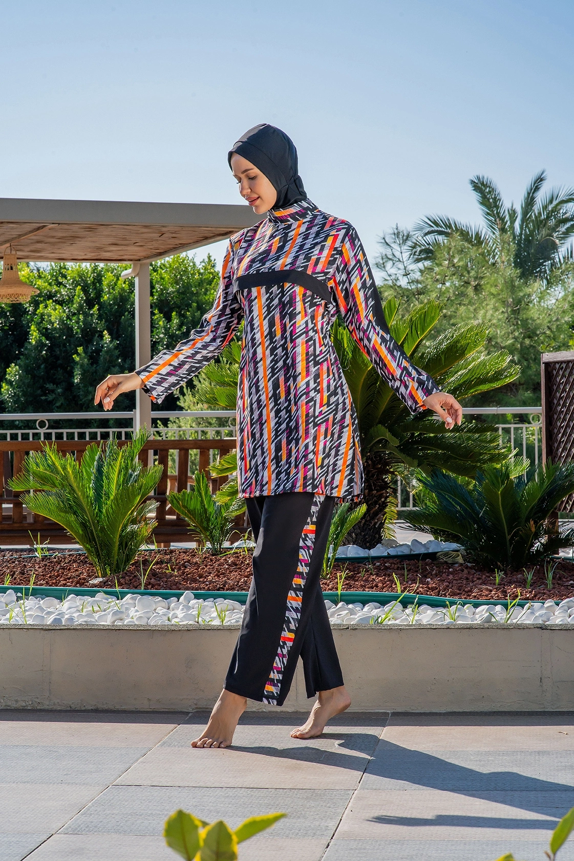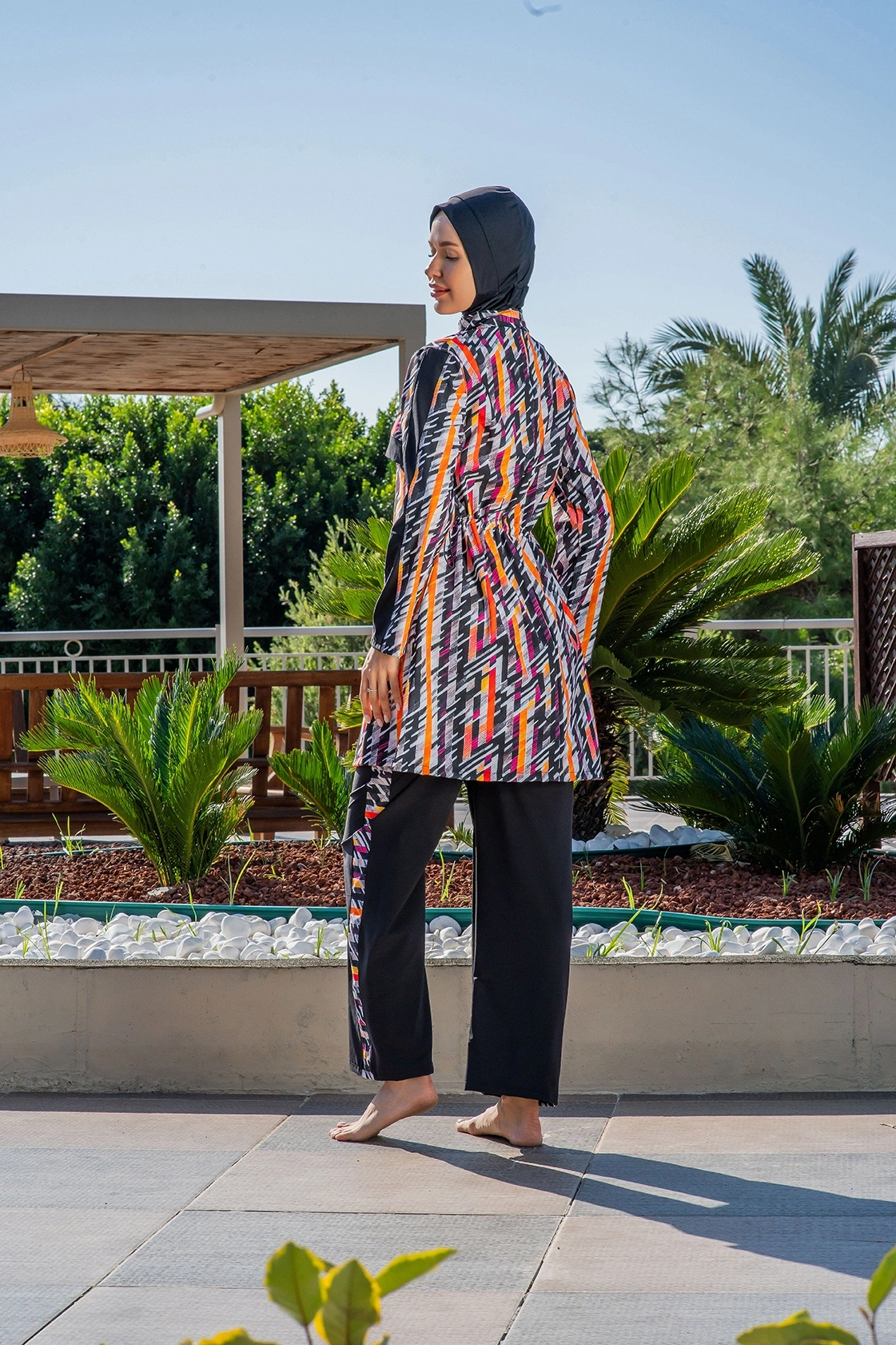 Ruko Kadın Tam Kapalı Geometrik Desenli Siyah Haşema Tesettür Mayo, siyahın asaletini canlı turuncu ve pembe tonlarındaki modern geometrik desenlerle birleştirerek, plaj ve havuz kullanımında şıklığı ve muhafazakar çizgileri bir arada sunar. Bone, tunik ve pantolon olmak üzere tam set olarak tasarlanan bu model, vücut hatlarını belli etmeyen dökümlü kesimiyle gün boyu kendinizi özgüvenli ve rahat hissetmenizi sağlar. Tunik kısmının arka bel bölgesinde yer alan ayarlanabilir stoperli kordon detayı, mayonun formunu isteğinize göre kişiselleştirmenize olanak tanıyarak su içinde tuniğin yukarı toplanmasını engeller. Yüksek kaliteli, su itici özelliğe sahip özel kumaş dokusu, sudan çıktıktan sonra dakikalar içinde kuruyarak üzerinizde ağırlık yapmaz ve soğuk algınlığı riskini minimize eder. Likralı ve esnek yapısı sayesinde yüzme esnasında hareket kısıtlamasını ortadan kaldırarak profesyonel bir yüzme deneyimi ve maksimum konfor vaat eder. Hakim yaka tasarımı ve tam boy fermuarlı/kapalı yapısı, güneşin zararlı ışınlarına karşı cildiniz için geniş bir koruma alanı oluştururken estetik bir duruş sergiler. Pantolonun paçalarında ve tunik kollarında yer alan desen uyumu, görsel bir bütünlük yaratarak modern tesettür mayo anlayışına sofistike bir dokunuş katar. Klora ve tuzlu suya karşı ekstra dayanıklı lif yapısı, desenlerin canlılığını ve kumaşın formunu sık kullanımlarda dahi ilk günkü yeniliğinde korumasını garantiler. Nefes alabilen hafif dokusu ve pürüzsüz iç yüzeyi, en sıcak havalarda bile cildinizin tazeliğini korumasına yardımcı olan sağlıklı ve hijyenik bir kullanım deneyimi yaşatır. Hem havuzda hem de denizde stilinden ödün vermeden konforu yaşamak isteyenler için ideal bir tercih olan bu Ruko haşema setini hemen sepetinize ekleyerek tatil keyfini doyasıya yaşayın.